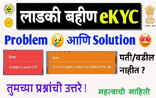 - सर्वात महत्त्वाची अडचण म्हणजे बऱ्याचशा लाभार्थी महिलांना ‘Unable to send OTP’ हा एरर येत आहे. याचे कारण असे आहे की या वेबसाईटवरती दोन कोटी पेक्षा जास्त महिला भेट देत आहेत. त्यामुळे या वेबसाईटला लोड येत आहे. याच्या वरती उपाय असा आहे की तुम्ही थोड्या दिवसांनी ई-केवायसी प्रक्रिया पूर्ण करावी किंवा रात्रीची ई-केवायसी प्रक्रिया पूर्ण करावी.